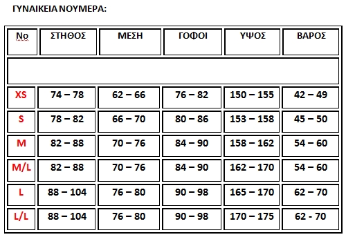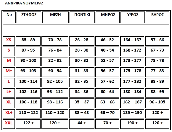 All models of our uniforms are available in standard numbers. Please use the tables below (all measurements are in centimeters).